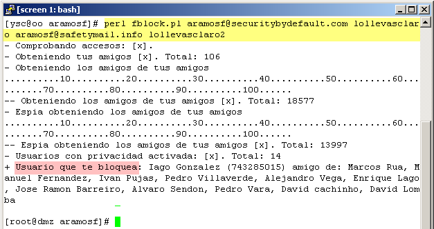 - La ejecución es lenta debido al elevado número de peticiones que son necesarias. Dependerá del número de nuestros amigos y la lÃnea de la que se disponga. Pero puede tardar entre 8 y 20 minutos.